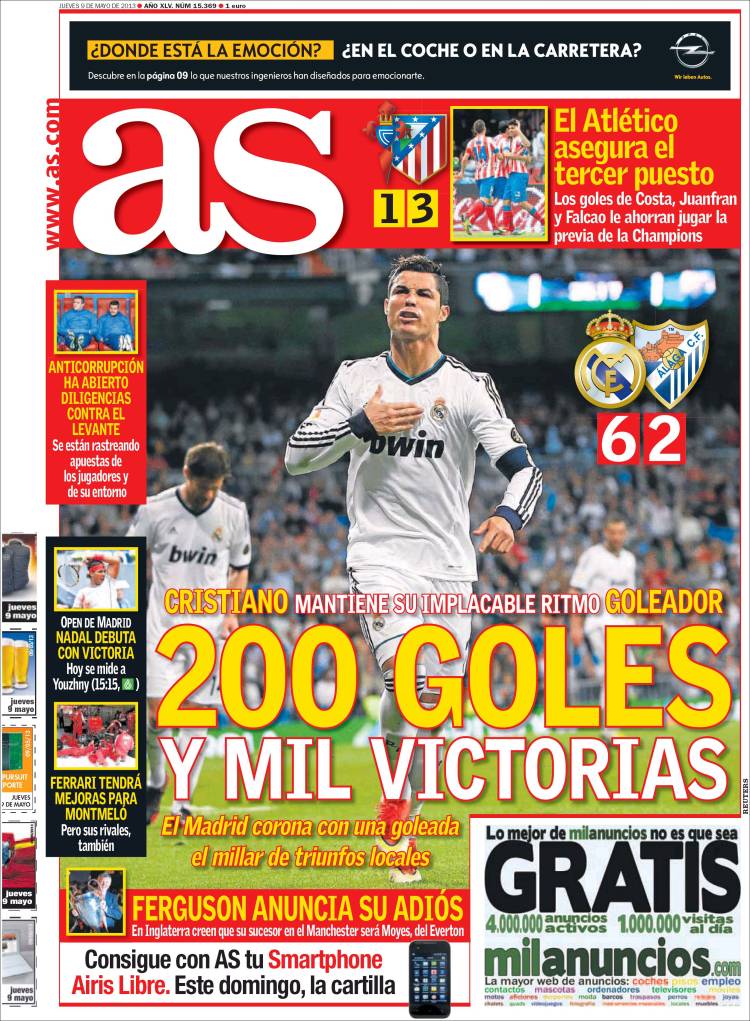 AS RONALDO REAL MADRID – Cristiano Ronaldo e il Real Madrid toccano i propri record dopo il sei a due inflitto al Malaga.