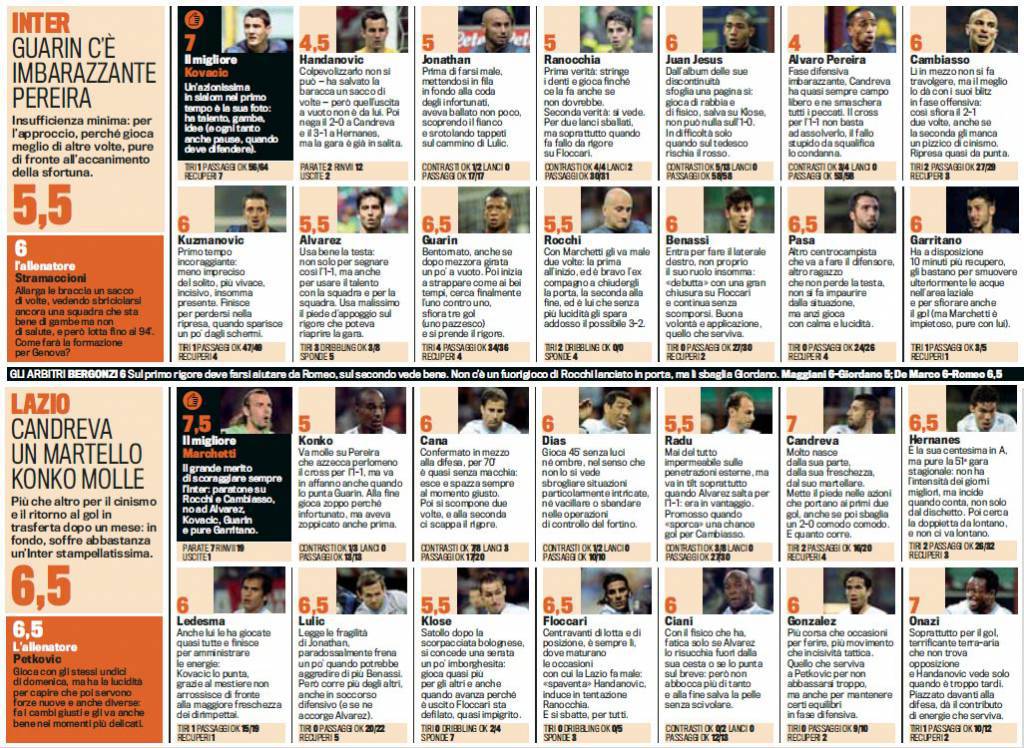 INTER LAZIO VOTI PAGELLE GAZZETTA SPORT – Poco più in basso troverete i voti e le pagelle Gazzetta dello Sport di Inter-Lazio, partita che si è giocata ieri sera allo stadio San Siro e che è terminata con il risultato di 3 a 1 in favore della Lazio. Una nuova sconfitta per i nerazzurri, ben 15 in stagione, che decretano l’esclusione definitiva da ogni coppa per la compagine meneghina. Brutta prova di Handanovic, autore di una papera, nonché di Alvaro Pereira. Male anche Alvarez, che sbaglia il rigore del possibile 2 a 2. Si salva solo Kovacic, punto fermo da cui ripartire.