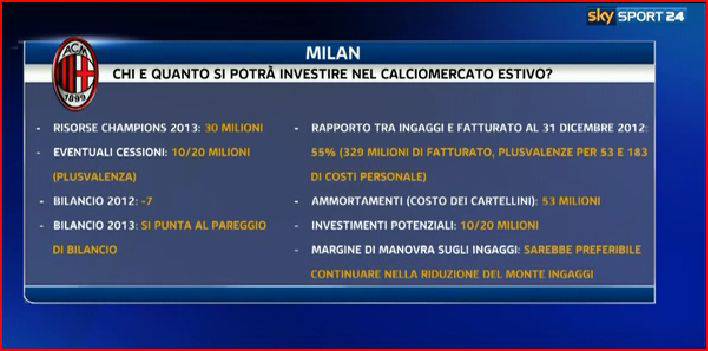 FOTO CALCIOMERCATO MILAN CIFRA ROSSONERI MERCATO – La redazione di Sky Sport 24, con un’interessante grafica, ha messo nero su bianco i possibili investimenti estivi del Milan. La società rossonera, al netto di guadagni e perdite, potrebbe infatti ritrovarsi un bel tesoretto con cui rinforzare l’organico già in estate. Proseguendo su questa campagna di taglio spese, contenimento dei costi e cessioni illustri, in pochi anni la squadra rossonera potrà certamente primeggiare in Italia con una politica fatta di scelte azzeccati, puntando su giovani di grande livello.