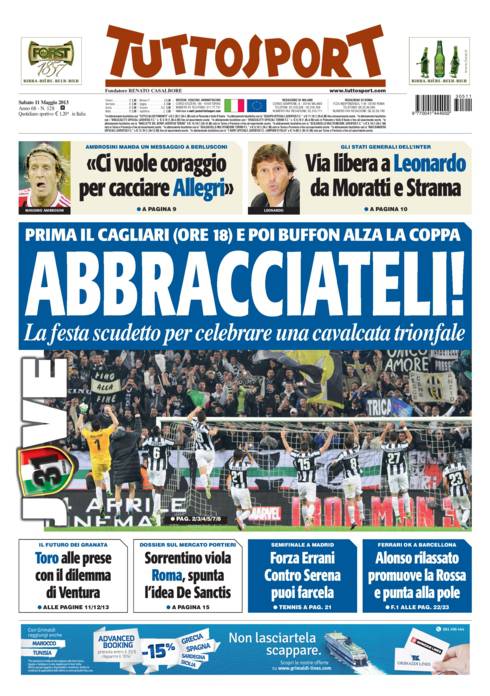 TUTTOSPORT JUVENTUS – Oggi alla ore 18 la Juventus affronterà il Cagliari e alzerà lo Scudetto.