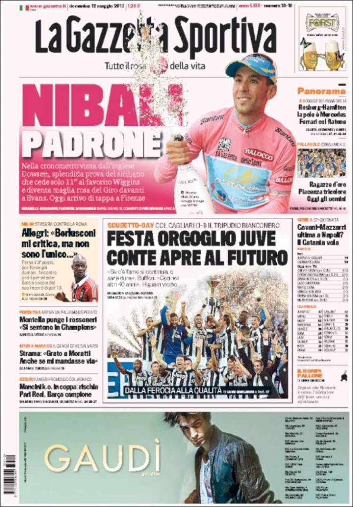 RASSEGNA STAMPA JUVENTUS CONTE – Col Cagliari 1-1, poi è tripudio bianconero. Se c’è fame si continua o sarà dura. Buffon: “Con noi altri 40 anni”. Higuain vicino. Allegri: “Berlusconi mi critica ma non solo l’unico…”. Montella punge i rossoneri: “Si sentono in Champions”. Stramaccioni: “Grato a Moratti anche se mi mandasse via”. Cavani-Mazzarri: ultima a Napoli?