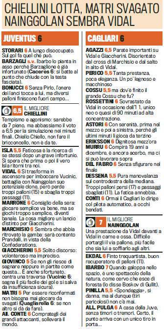 JUVENTUS CAGLIARI VOTI PAGELLE GAZZETTA SPORT – Poco più in basso troverete i voti e le pagelle Gazzetta dello Sport di Juventus-Cagliari, anticipo della 37esima giornata di Serie A conclusosi con il risultato di parità, 1 a 1. Migliore dell’incontro è Giorgio Chiellini, autore di una buonissima prestazione. Male invece Alessandro Matri, troppo svagato e forse con la mente già alle vacanze estive. In casa rossoblu grande proba di Nainggolan, il migliore in assoluto della sfida di ieri, che come scrive la Gazza sembra Vidal…