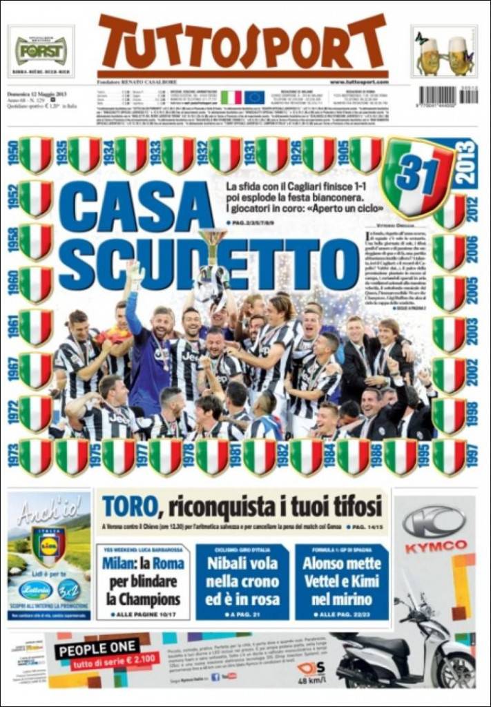 RASSEGNA JUVENTUS FESTA SCUDETTO – La sfida con il Cagliari finisce 1-1 (Ibarbo, Vucinic), poi esplode la grande festa bianconera. I giocatori, in coro: “Aperto un ciclo“. Milan, la Roma per blindare la Champions.