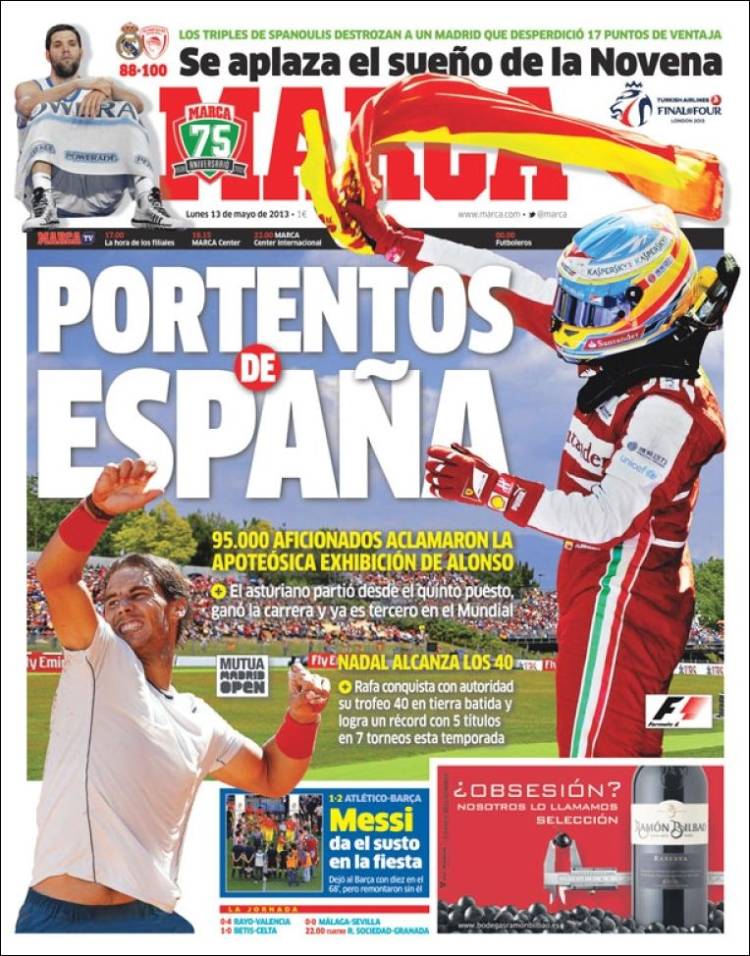 MARCA SPAGNA – Alonso vince il Gran Premio di Spagna mentre Nadal vince il Master di Madrid.