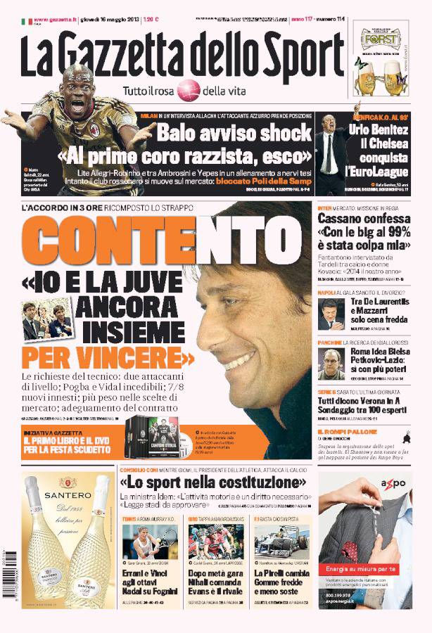 GAZZETTA CONTE – Sulla Gazzetta dello Sport si parla di Conte che ha trovato l’accordo con la Juventus e continuerà ad allenarla.