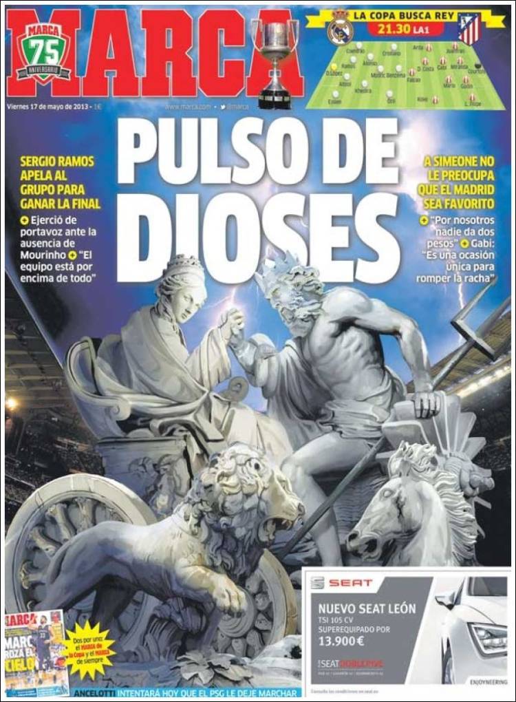 MARCA REAL MADRID ATLETICO – Il quotidiano Marca parla della finale di Copa del Re tra l’Atletico Madrid di Simeone e il Real Madrid di Mourinho.