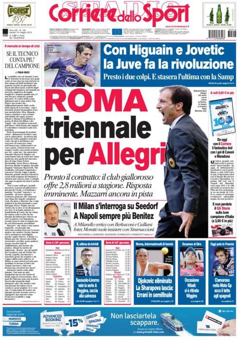 CORRIERE ALLEGRI – Sul Corriere dello Sport si parla di Allegri, la Roma è pronta a offrire un triennale al tecnico.