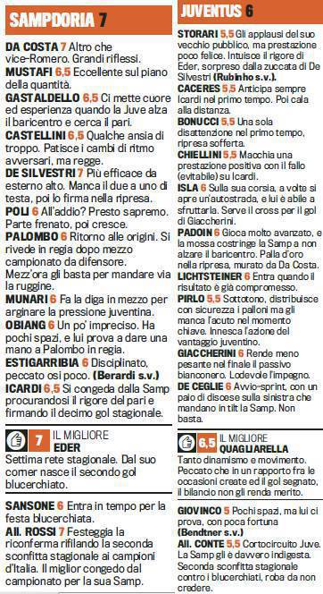 SAMPDORIA JUVENTUS 3-2 VOTI PAGELLE GAZZETTA DELLO SPORT FOTO – Una partita scoppiettante che ancora una volta ha mostrato le difficoltà della Juventus nel battere la Sampdoria di Delio Rossi, unica delle 19 squadre avversarie dei campioni d’Italia ad uscire imbattuta dal doppio confronto. 3-2 per i padroni di casa che hanno dimostrato grandissima intelligenza tattica, mettendo a nudo tutte le difficoltà di una squadra arrivata alla conclusione di due stagioni davvero intense che hanno portato due scudetti. Ecco i voti e le pagelle della gara tratte dalle colonne della Gazzetta dello Sport.