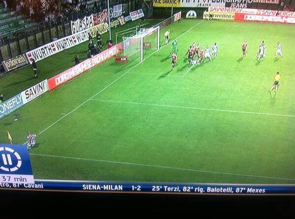 FOTO SIENA MILAN – Oltre al discusso rigore concesso a Balotelli, durante Siena-Milan c’è un altro rigore (non fischiato) sotto la lente di ingrandimento. Si tratta del fallo di Ambrosini su Vitiello in occasione di un calcio d’angolo. Il club toscano ha protestato per questo episodio ma i replay danno ragione a Bergonzi. Come si vede nel fermo immagine, infatti, il fallo avviene a gioco fermo, prima che il corner venisse battuto, e di conseguenza non è possibile assegnare un calcio di rigore a gioco fermo.