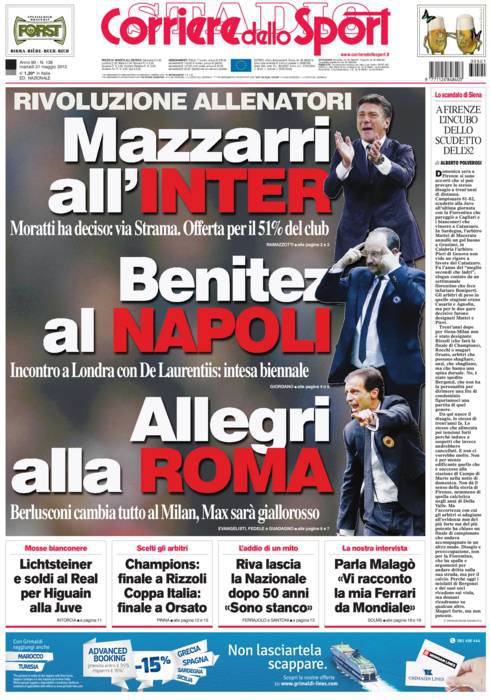 CORRIERE BENITEZ ALLEGRI – Non solo Mazzarri all’Inter, Benitez verso Napoli e Allegri a Roma.