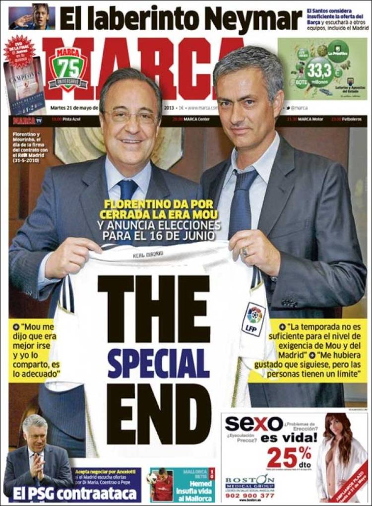 MARCA MOURINHO – E’ finita l’avventura a Madrid di José Mourinho, Perez ha liberato l’allenatore portoghese.