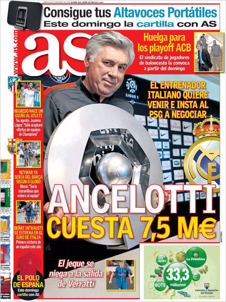 AS ANCELOTTI – Sul quotidiano As si parla di Ancelotti che potrebbe liberarsi dal Real Madrid per 7,5 milioni di euro.