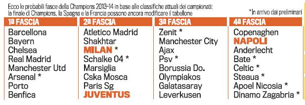 CHAMPIONS LEAGUE MILAN JUVENTUS NAPOLI FOTO – Il Milan è la squadra italiana che parteciperà ai preliminari di Champions League per accedere al tabellone principale che può già essere diviso tra squadre di prima, seconda, terza, quarta fascia a secondo del coefficiente Uefa. In caso di qualificazione al tabellone principale il Milan sarebbe in seconda fascia assieme alla Juventus. Mentre il Napoli sarebbe inserito in quarta fascia, quindi è probabile un sorteggio davvero duro. In prima fascia ci sono Barcellona, Bayern Monaco, Chelsea, Real Madrid, Manchester United, Arsenal, Porto, Benfica. Ovviamente la finale di Champions League e le ultime partite della Liga e della Ligue 1 potrebbero cambiare il tabellone. Ecco la foto della Gazzetta dello Sport.