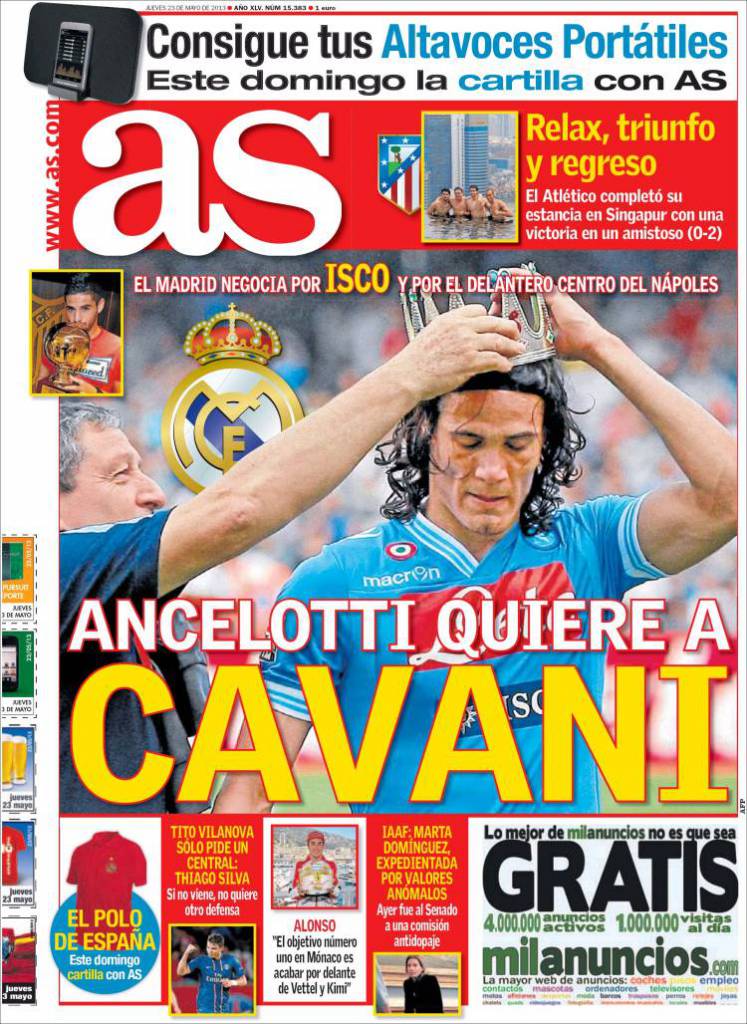 AS ANCELOTTI CAVANI – Sul quotidiano As si parla di Ancelotti che chiede Cavani come attaccante per la prossima stagione.