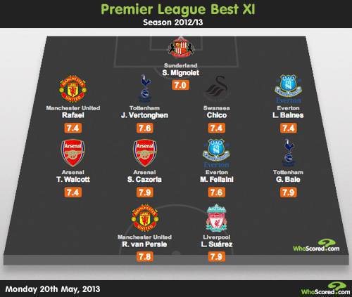FOTO BEST 11 2012-2013 PREMIER LEAGUE – Si è ormai concluso da una settimana il massimo campionato inglese di calcio, conosciuto da tutti come Premier League. La competizione britannica, da molti indicata come il più bel campionato al mondo, ha quest’anno messo in mostra qualità eccellenti da parte di tanti calciatori di grande livello, a testimonianza del fatto che al momento insieme alla Bundesliga tedesca, la Premier è il torneo più affascinante dove giocare. Il noto sito di statistiche WhoScored, ha realizzato la top 11 di questa stagione. Non può mancare Robin Van Persie, attaccante che ha deciso il campionato consegnandolo nelle mani di Sir Alex Ferguson.