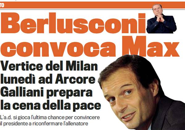 Mercato News Allegri Milan Berlusconi- Invito a cena con delitto. Il cadavere può essere o di Allegri (che potrebbe essere esonerato ufficialmente), oppure della Roma, che morirebbe d’invidia nel vedere il tecnico toscano fare la pace con il presidente Berlusconi. Allegri e Galliani, lunedì sera, voleranno ad Arcore per cenare col numero 1 rossonero, dopo aver trascorso un romantico week end a Londra per assistere alla finale di Champions. I tre discuteranno delle ultime scelte di Allegri, che a Siena ha rischiato seriamente di vanificare la rincorsa al terzo posto. Se il tecnico riuscirà a convincere il presidente della bontà del suo lavoro, allora potrà restare, alrtrimenti…spazio a Seedorf.