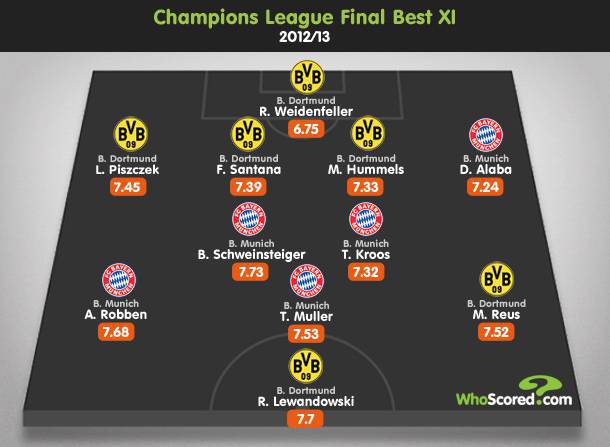 FOTO TOP 11 FINALE CHAMPIONS LEAGUE WHOSCORED BORUSSIA – Chi avrà la meglio nella finale tutta tedesca di questa sera? Sarà una sfida avvincente a dir poco quella tra Borussia Dortmund e Bayern Monaco, squadre da sempre rivali che cercheranno di alzare al cielo la Uefa Champions League. La redazione di Whoscored, noto sito di statistiche e dati calcistici, ha realizzato un’interessante top 11 che mette in campo i migliori di Borussia e Bayern. Certo, è strano vedere tra i pali Weidenfeller e non Neuer, ma i numeri, come sempre, valgono molto più delle chiacchiere…