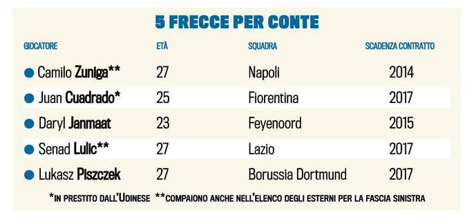 CALCIOMERCATO JUVENTUS CONTE ESTERNI FOTO 5 NOMI – Per poter attuare il tanto sperato cambio di modulo dal 3-5-2 al 4-3-3, Antonio Conte ha bisogno di nuovi esterni d’attacco con caratteristiche differenti rispetto agli uomini già presenti nella rosa della Juventus. Tuttosport stamani ha realizzato un’interessante grafica che mette insieme 5 papabili laterali per la Juve che verrà. Zuniga del Napoli, nel mirino dell’Inter di Mazzarri, Cuadrado della Fiorentina, Janmaat del Feyenoord, Lulic della Lazio e Piszczek del Borussia Dortmund. Un lotto davvero niente male…