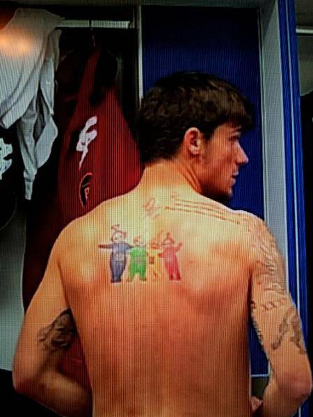FOTO DESSENA CAGLIARI TELETUBBIES – Una scelta discretamente discutibile quella di Daniele Dessena, centrocampista del Cagliari che, all’interno degli spogliatoi, alle telecamere di Sky Sport, ha sfoggiato un tatuaggio particolare che siamo certi avrà una dedica ben precisa. Dessena ha infatti impressi sulla sua pelle i quattro Teletubbies, personaggi di un noto programma televisivo per bambini. Può ovviamente suscitare ilarità questa immagine, ma bisogna ricordare che non è il solo calciatore con un Teletubbies tatuato: anche Daniele De Rossi, vice capitano della Roma, ne ha uno sul braccio destro, dedicato alla figlia.