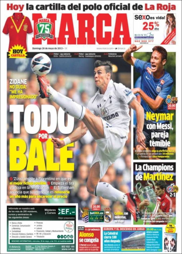 RASSEGNA STAMPA REAL MADRID BALE – Il Real Madrid ha scelto il colpo della nuova era, quella che dovrà segnare il rilancio delle merengues dopo la disfatta dell’Era Mourinho: Gareth Bale. Zinedine Zidane non ha dubbi: è il migliore nel suo ruolo. Florentino Perez cercherà di portarlo a Madrid ma il Tottenham vorrebbe trattenerlo un altro anno per aumentare il prezzo.