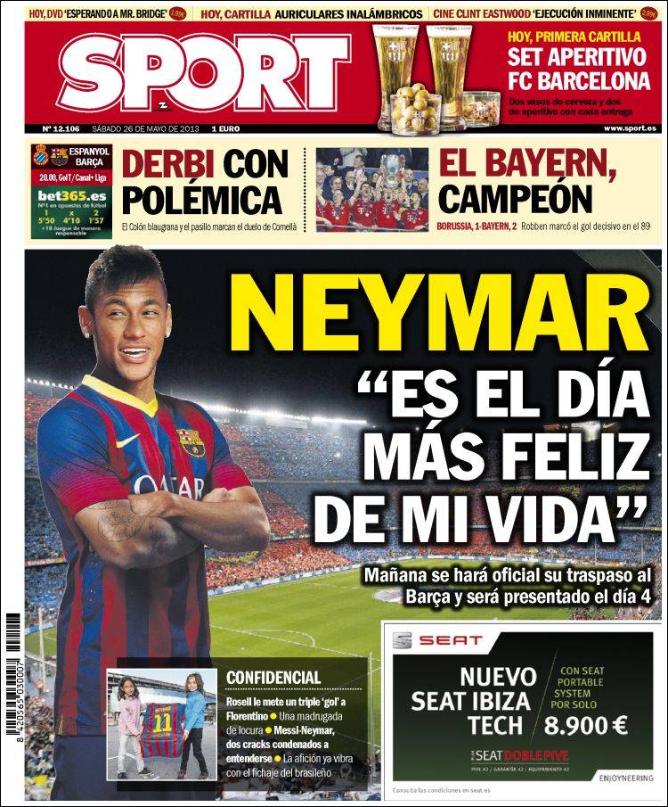 RASSEGNA STAMPA BARCELLONA NEYMAR – Neymar ha scelto il Barcellona dichiarando che è il giorno più bello della sua vita. Il brasiliano raggiungerà Lionel Messi andando a formare una delle coppie più temibili del calcio. Il Bayern Monaco è Campione d’Europa.