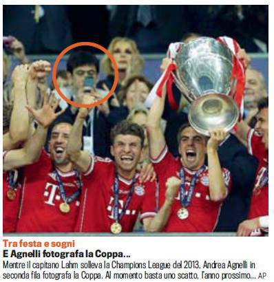 FOTO AGNELLI CHAMPIONS LEAGUE BAYERN – Presente sabato scorso nella tribuna d’onore dello stadio di Wembley, Andrea Agnelli, presidente della Juventus, accorso dall’Italia per assistere alla sfida tutta tedesca che ha poi assegnato la Champions League al Bayern Monaco. Agnelli non si è voluto perdere nemmeno un attimo della premiazione, fotografando addirittura, come ripreso da questa immagine apparsa sulla Gazzetta dello Sport, il momento in cui capitan Lahm ha alzato la coppa dalle grandi orecchie al cielo. Sognando il prossimo anno di poter vedere i ragazzi in bianconero con quella coppa…