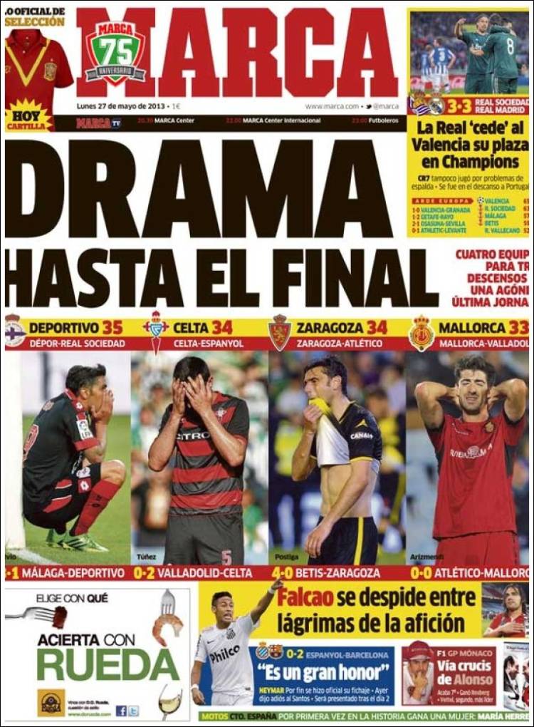 MARCA LIGA – Sul quotidiano Marca si parla della Liga spagnola che nell’ultima giornata dovrà decretare chi saranno le squadre a scendere nella lega inferiore.