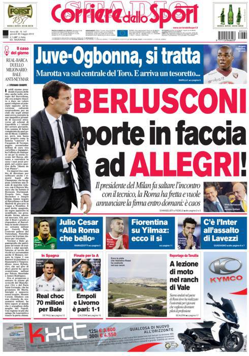 CORRIERE BERLUSCONI – Sul Corriere dello Sport si parla di Berlusconi che ha fatto saltare l’incontro con Allegri. Il futuro del tecnico toscano è sempre un mistero.