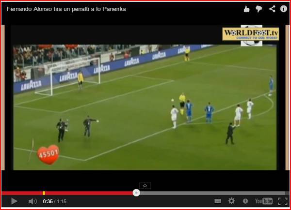 VIDEO CUCCHIAIO ALONSO – Fernando Alonso, il pilota della Ferrari, non ha mai nascosto la sua passione per il calcio ma aveva sempre tenuto nascosto le sue doti tecniche. Martedì sera, però, Alonso ha partecipato alla Partita del cuore. Durante il match, il compagno di squadra di Alonso, il tecnico della Juventus, Antonio Conte, ha subito un fallo di rigore che Alonso ha battuto. Il portire avversario era Lentini che è stato battutto da un bellissimo cucchiaio.