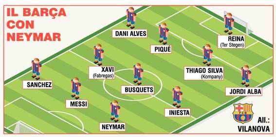 CALCIOMERCATO BARCELLONA NEYMAR – Il Barcellona ha appena concluso una stagione nella quale sono emersi i primi segni di una certa usura collettiva. Questo lo si è potuto vedere soprattutto nella semifinale di Champions League quando i blaugrana sono stati demoliti da un superiore Bayern Monaco. Ecco quindi che la dirigenza del Barça non vuol farsi trovare impreparata e, per il futuro, ha già pronto l’antidoto a tutti i mali: Neymar. Il giovane brasiliano è il rinforzo che dovrà formare una coppia da sogno assieme all’idolo indiscusso del Camp Nou Leo Messi. In ogni caso, vediamo come potrebbe giocare il Barcellona con Neymar. Lo stile di gioco rimarrà presumibilmente sempre il solito ovvero quello teso al possesso palla e con accelerazioni improvvise. Classico 4-3-3 per Vilanova con il centrocampo identico a quello dell’appena conclusa stagione. La novità sta nel tridente offensivo con Messi che si troverebbe Sanchez da una parte e appunto Neymar dall’altra. Villa potrebbe quindi essere la pedina sacrificata per risanare i bilanci.