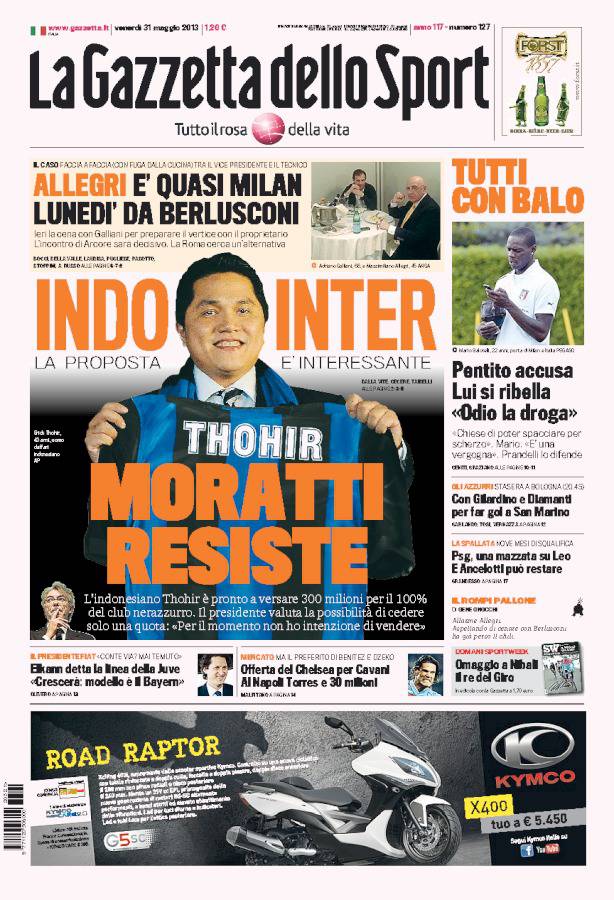 GAZZETTA MORATTI – Sulla Gazzetta dello Sport si parla di Thoir, imprenditore indonesiano che vuole l’Inter ma Moratti resiste.
