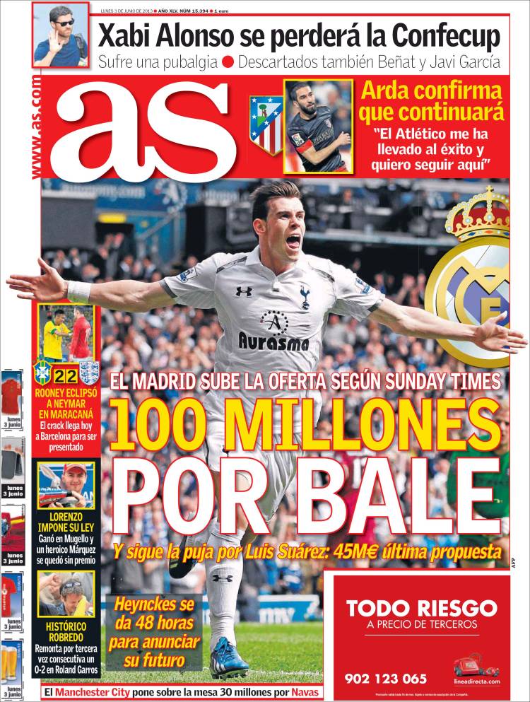 AS BALE – Sul quotidiano As si parla di Bale, il Real Madrid vorrebbe offrire 100 milioni di euro.