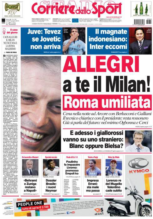 CORRIERE ALLEGRI MILAN – Sul Corriere dello Sport si parla di Allegri che resterà al Milan, la Roma dovrà puntare su un altro allenatore.