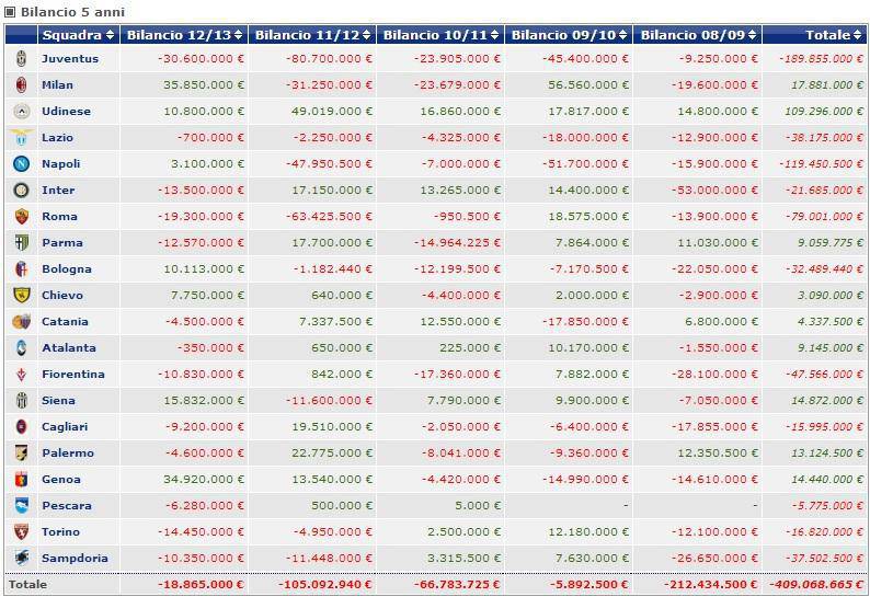FOTO SERIE A SPESE MERCATO ROSSO – Con una grafica estrapolata da Transfermarkt, ci vogliamo concentrare oggi sulla differenze tra spese e ricavi sul calciomercato delle 20 squadre che hanno giocato la Serie A 2012-2013. Andando a controllare infatti le spese sul mercato negli ultimi 5 anni delle massime squadre italiane. Il colpo d’occhio è senza dubbio evidente: rispetto a qualche anno fa, il confronto con le cifre sborsate quest’anno è davvero impietoso. E’ la Juventus a riportare il rosso più evidente dove per rosso si intende non tanto un passivo di bilancio, quanto invece le somme incassate dalle cessioni, meno i milioni sborsati per gli acquisti sul mercato. Curiosa la situazione del Milan che, grazie alle cessioni eccellenti di questa stagione e del 2009/2010 si ritrova con un attivo 17 milioni di euro.
