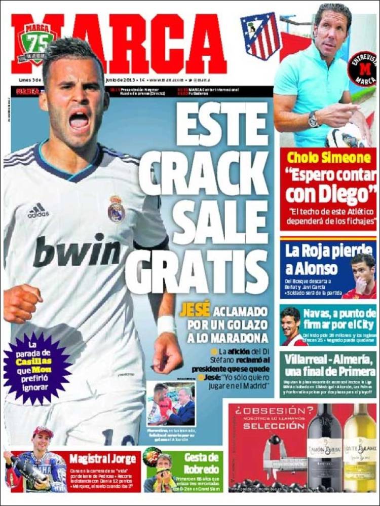 MARCA JESE’ – Il quotidiano Marca parla di Jesé, fenomeno del Real Madrid che è in scadenza di contratto nel 2014.