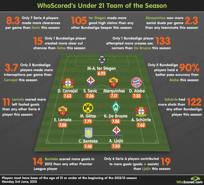 CALCIOMERCATO TOP UNDER 21 – Sono giovani ma danno già del filo da torcere ad avversari con più esperienza di loro. La stagione calcistica 2012/2013 si è conclusa ed ora è tempo di bilanci. Come si può vedere in foto, ecco la formazione top dei giovani “Under 21” provenienti da tutta Europa secondo Whoscored.com. Gli “italiani”, ovvero coloro che militano nella nostra Serie A, sono quattro: Ljajic (Fiorentina), Lamela (Roma),  Savic (Fiorentina) e Marquinhos (Roma). In porta spazio al protiere tedesco ter Stegen (Borussia M.). Difesa con Carvajal (Bayer Leverkusen) e Alaba (Bayern Monaco). A centrocampo Gotze (Borussia D.), De Bruyne (Werder Brema) e Schurrle (Bayer Leverkusen). Partner di Ljajic, Benteke dell’Aston Villa.