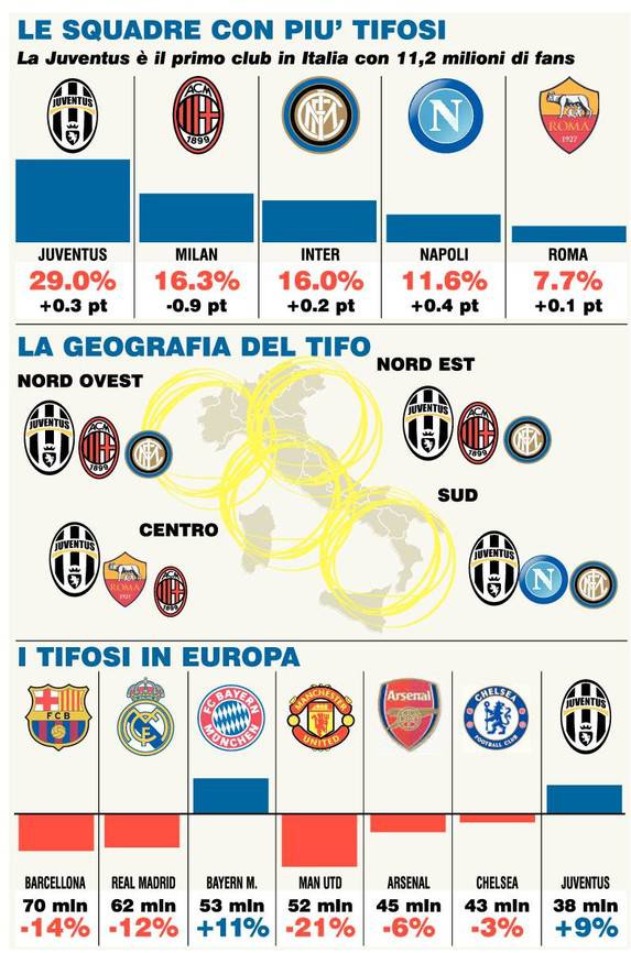 FOTO MAPPA TIFO ITALIA JUVENTUS – Una mappa davvero interessante quella pubblicata stamani dal quotidiano Tuttosport che ha messo in evidenza le squadre più tifate in Italia, dividendo la nazione in 4 aree. Come era logico pensare, è la Juventus a dominare in tutto lo stivale, raccogliendo la bellezza di 11,2 milioni di tifosi, un buon 29% di tutti i supporters italiani. A seguire il Milan con 0.3 punti di percentuale in più rispetto ai cugini del Milan. Curioso il dato, sebbene noto da tempo, come in tutte le regioni la Juventus risulti essere la più tifata. Anche e soprattutto al sud.