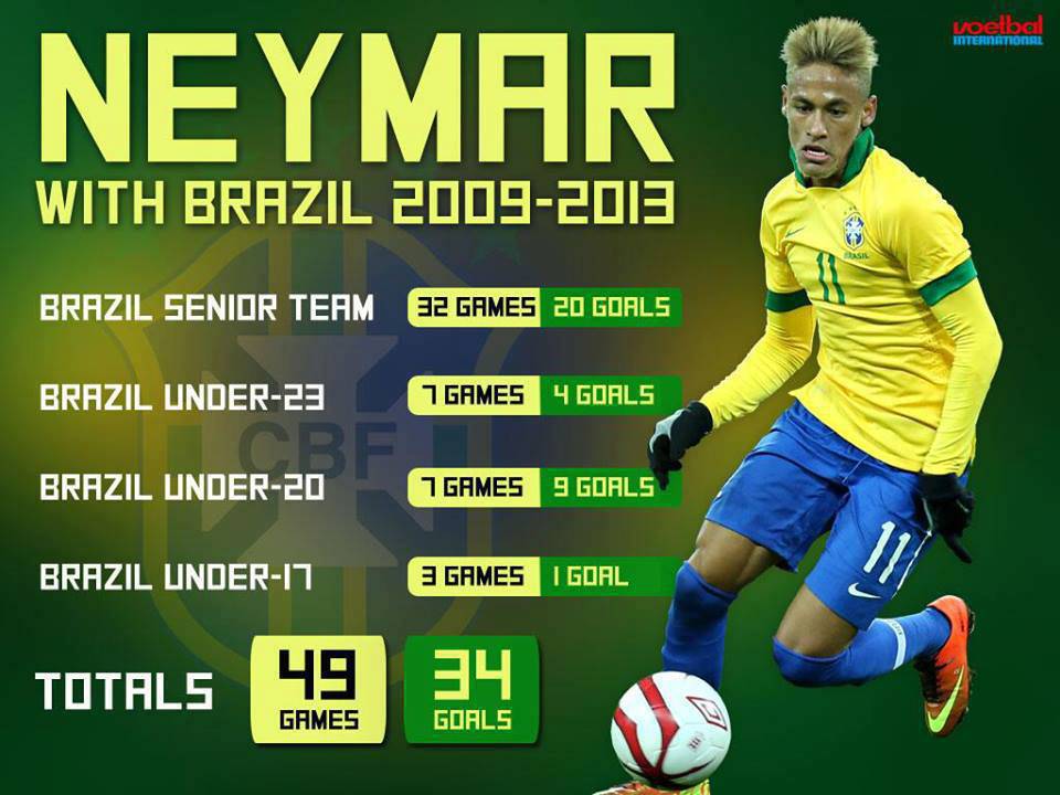 FOTO STATISTICHE NEYMAR BRASILE – E’ passato ufficialmente da poche ore al Barcellona, il fenomeno classe 1992 Neymar, pronto a misurarsi finalmente con il calcio europeo. Una interessante grafica pubblicata stamani da SoccerBible, rivela alcune cifre del fantasista verdeoro: vengono riportate infatti le reti siglate con le maglie della nazionale brasiliana, sia under che maggiore, nel corso della sua carriera. Numeri da grandissimo fuoriclasse quelli dell’ex Santos Neymar, deciso adesso ad illuminare con le sue giocate anche il Camp Nou.