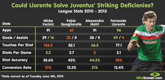 FOTO LLORENTE JUVENTUS – E’ evidente, e se ne parla ormai da tempo: i problemi della Juventus sono soprattutto in attacco. Spesso infatti, la enorme mole di gioco espressa dalla squadra bianconera, non viene convertita in rete, sprecando grandissime possibilità. Con l’arrivo, già ufficiale da mesi, di Fernando Llorente, la situazione in casa bianconera potrebbe radicalmente cambiare. La redazione di Whoscored.com ha realizzato questa interessante grafica che mette a confronto le capacità realizzative del bomber spagnolo e degli attuali attaccanti bianconeri.