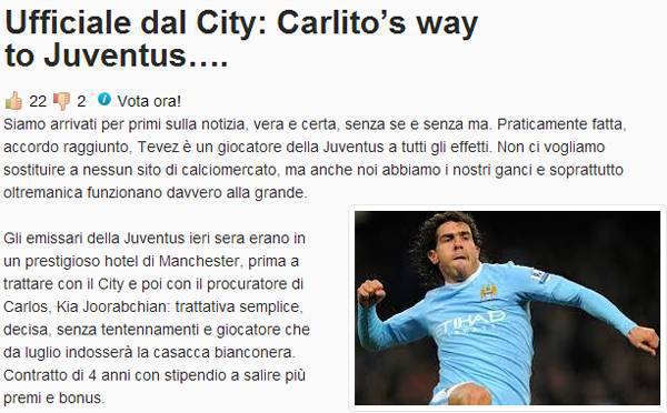 CALCIOMERCATO JUVENTUS – E’ una vera e propria bomba di mercato quella sganciata dal noto sito per scommesse, Paddy Power. Forse per la prima volta nella storia un sito non di calciomercato ha anticipato un’operazione e che operazione! Si tratta infatti del passaggio di Tevez dal City alla Juve: “Siamo arrivati per primi sulla notizia, vera e certa, senza se e senza ma – scrive PP – Praticamente fatta, accordo raggiunto, Tevez è un giocatore della Juventus a tutti gli effetti. Non ci vogliamo sostituire a nessun sito di calciomercato, ma anche noi abbiamo i nostri ganci e soprattutto oltremanica funzionano davvero alla grande. Gli emissari della Juventus ieri sera erano in un prestigioso hotel di Manchester, prima a trattare con il City e poi con il procuratore di Carlos, Kia Joorabchian: trattativa semplice, decisa, senza tentennamenti e giocatore che da luglio indosserà la casacca bianconera. Contratto di 4 anni con stipendio a salire più premi e bonus”. Poi ancora: “L’Apache argentino non sembrava intenzionato a rinnovare il contratto con i citizens, a quel punto, c’era il rischio vero di perderlo oppure che il costo dell’attaccante lievitasse incondizionatamente, cosa che la Juve non voleva che succedesse. L’offerta dei bianconeri accontenta tutti: in primis il Man City che altrimenti avrebbe visto partire Carlos a prametro zero a Gennaio e soprattutto il giocatore che è entusiasta di misurarsi nella serie A italiana. Grande colpo di Paddy Power…un ringraziamento ai nostri fedeli collaboratori d’oltremanica che ci hanno mandato in anteprima questa notizia importante. A proposito, non penserete certo di trovare questa notizia sui giornali nei prossimi giorni vero? Ne passeranno di giorni: è il teatrino del mercato…vedrete, oggi si, domani no, oggi forse, domani chissà, ma voi statene certi, Tevez è bianconero!”.