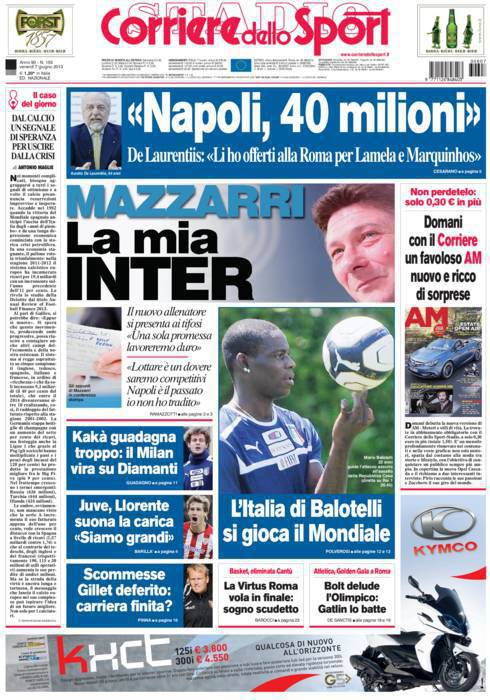 Corriere dello Sport: “Napoli, 40 milioni” 07/06/2013 di Admin3 CORRIERE NAPOLI – De Laurentiis rivela di aver offerto 40 milioni di euro alla Roma per Lamela e Marquinhos. La redazione di Calciomercatonews.com