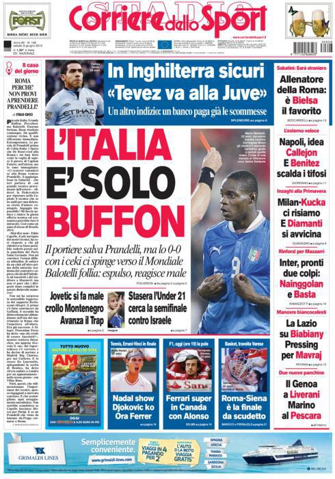 CORRIERE ITALIA – Sul Corriere dello Sport si parla della prova della Nazionale di Prandelli contro la Repubblica Ceca. Zero a zero con Buffon strepitoso e Balotelli che prende un cartellino rosso.