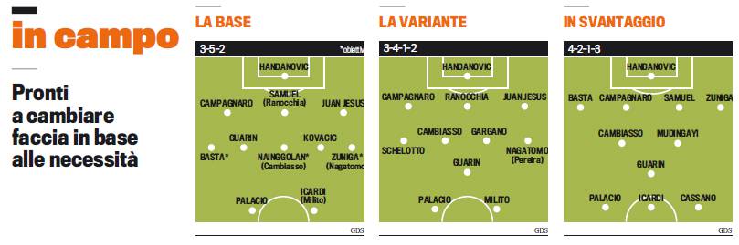 FOTO MAZZARRI INTER – Walter Mazzarri ha le idee chiarissime: riportare l’Inter ai livelli della sua fama dopo una stagione deludente. L’anno che verrà sarà orfano delle competizioni europee e, senza Champions League o Europa League, i tifosi si aspettano di tornare a lottare per i vertici della Serie A. Non sarà facile ma l’ex allenatore del Napoli ha già stabilito con quale modulo giocheranno i nerazzurri la prossima stagione. Si parte con un 3-5-2 con meccanismi che rimandano al recente passato di Mazzarri sulla panchina partenopea: due esterni offensivi, Basta e Zuniga, con al centro del campo un trio qualità e quantità composto da Kovacic, Nainggolan e Guarin. La variante vede un centrocampista (Guarin?) avanzare e indossare le vesti di rifinitore per il tandem offensivo. C’è anche la terza ipotesi ovvero quella da usare quando l’Inter è in svantaggio. Un 4-3-3 super offensivo che lascia ben poco all’immaginazione.