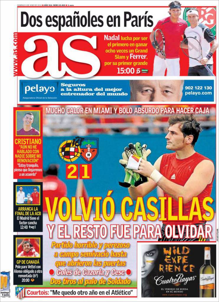 RASSEGNA STAMPA AS SPAGNA HAITI – A Miami, la Spagna comincia il suo percorso di avvicinamento alla Confederation Cup contro Haiti. Nonostante un avversario nettamente inferiore, la Spagna non è riuscita ad imporre il proprio gioco come al solito e subisce anche gol. Le reti spagnolo sono state segnate da Cazorla e Fabregas. Nota lieve: il ritorno di Casillas.
