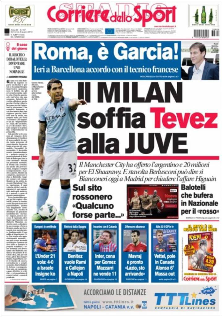 RASSEGNA STAMPA CORRIERE DELLO SPORT MILAN JUVENTUS TEVEZ – Il Manchester City ha offerto l’argentino e 20 milioni per El Shaarawy. E stavolta Berlusconi può dire di sì. Bianconeri oggi a Madrid per chiudere l’affare Higuain. Sul sito rossonero: “Qualcuno forse parte…”. Balotelli, che bufera in Nazionale per il rosso. Roma, è Garcia: ieri, a Barcellona, accordo con il tecnico francese.