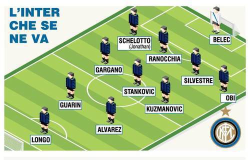 FOTO CALCIOMERCATO INTER 11 VALIGIE PARTENTI – Con l’arrivo di Walter Mazzarri potremmo assistere ad una smobilitazione generale in casa Inter. Le richieste del tecnico livornese sono chiare e precise: servirà un organico ristretto, massimo 23 giocatori, con calciatori che possano saper indossare la veste tattica “mazzarriana” alla perfezione. Il Corriere dello Sport ha messo in campo una formazione di possibili partenti in estate. Non mancano nomi eccellenti tra cui Ranocchia, apparentemente destinato alla Juventus, Stankovic ed addirittura il talentuoso colombiano Fredy Guarin.