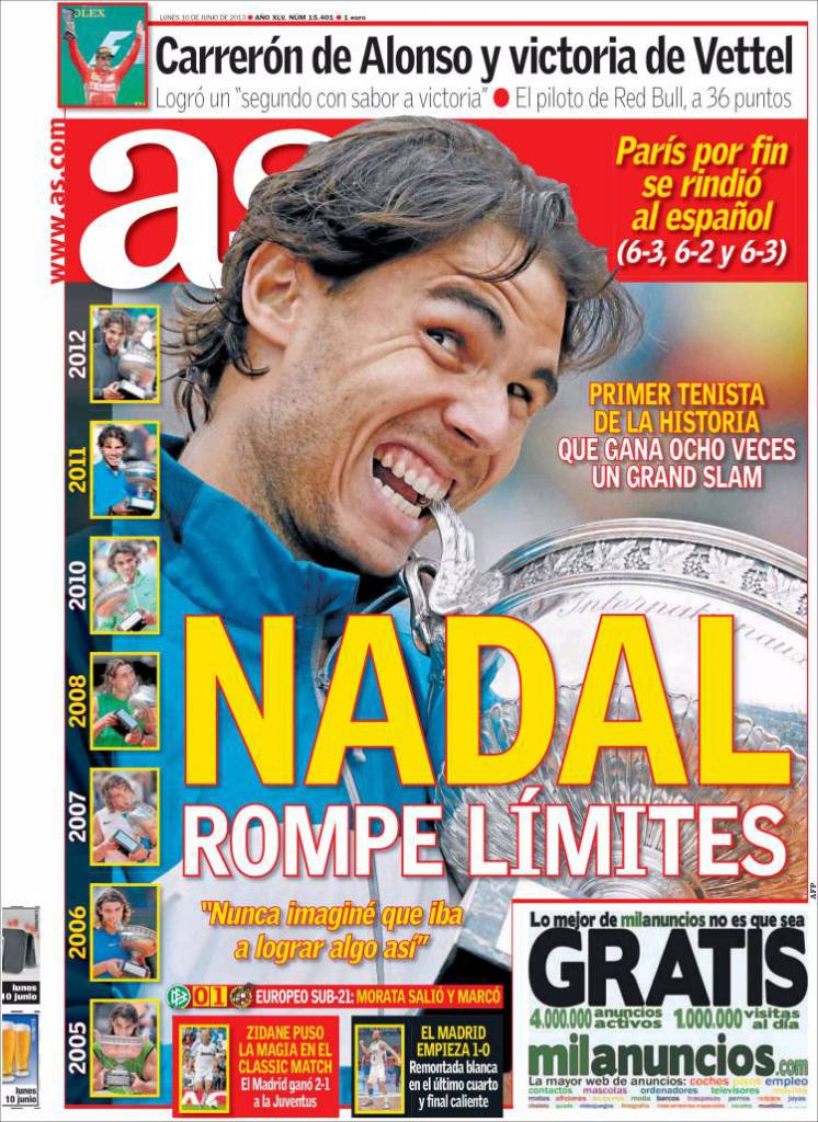AS NADAL – Sul quotidiano As si parla di Nadal che vince l’ottavo Roland Garros e vola verso la leggenda.