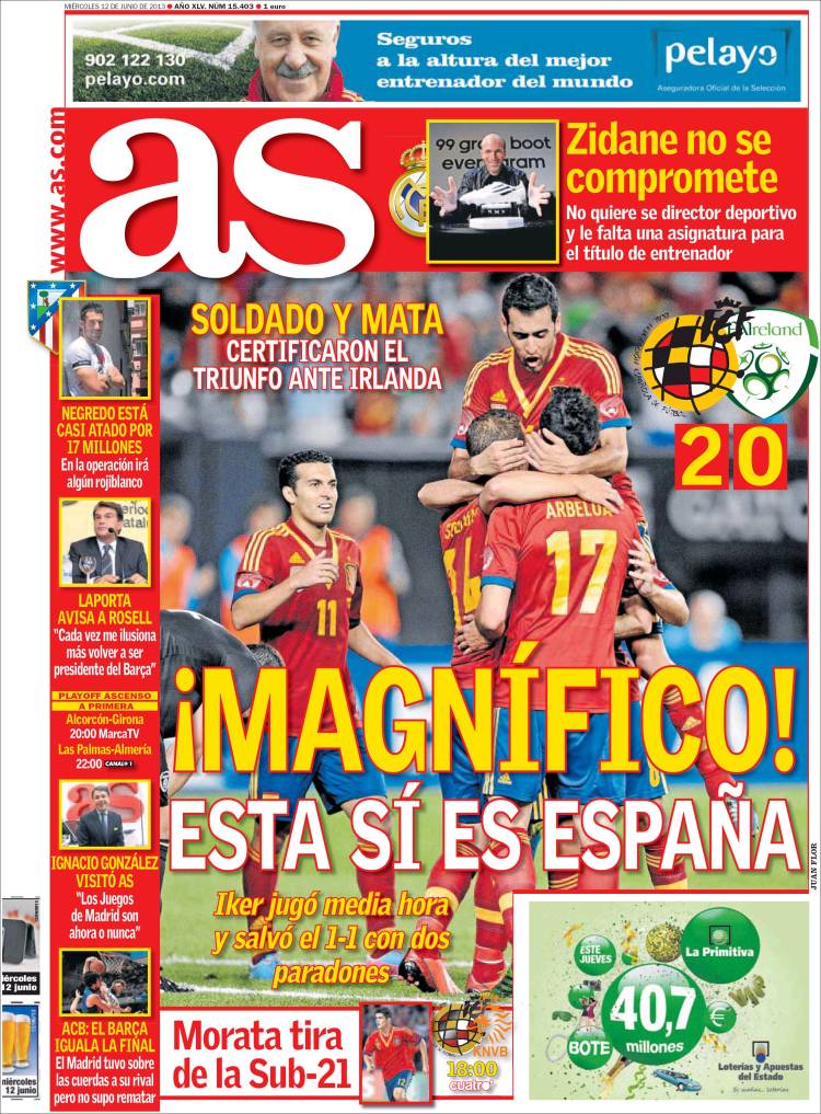 AS SPAGNA – Sul quotidiano As si parla della Spagna che vince due a zero contro l’Irlanda con un grande gioco corale.
