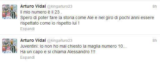 VIDAL MAGLIA 10 – “Spero di poter fare la storia come Ale e nel giro di pochi anni essere rispettato come io rispetto lui! Io non ho chiesto la 10, quella maglia ha un capo e si chiama Alessandro…”. Con queste parole Arturo Vidal ha voluto fare chiarezza sul proprio profilo Twitter sulla questione maglia numero 10, dopo le indiscrezioni circolanti ad inizio settimana.