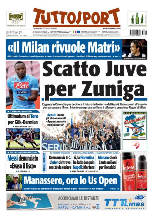 TUTTOSPORT ZUNIGA – Su Tuttosport si parla del laterale colombiano Zuniga che piace alla Juventus.